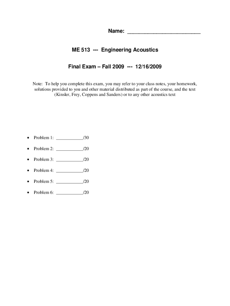 Name: ME 513 Engineering Acoustics Final Exam Fall 2009 12/16/2009 Note: To help you complete this exam, you may refer to your class notes, your homework, solutions provided to you and other material
