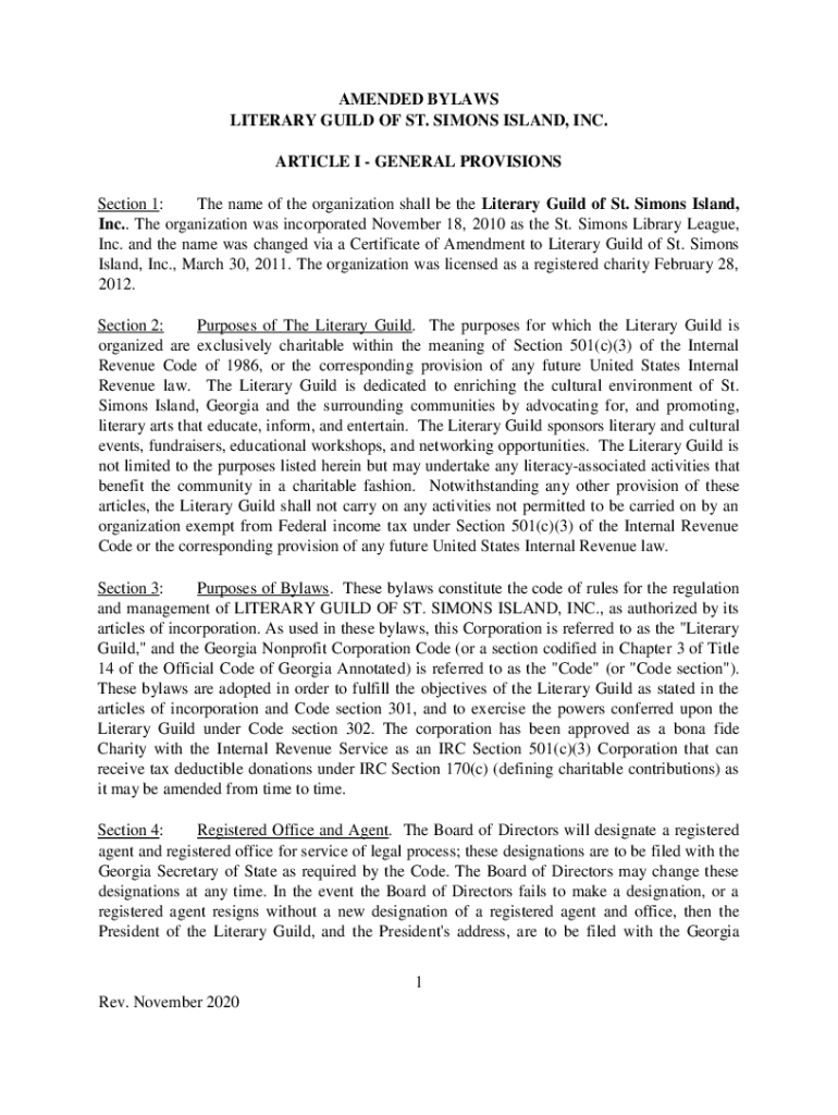 AMENDED BYLAWS LITERARY GUILD OF ST. SIMON ISLAND, INC. ARTICLE I GENERAL PROVISIONS Section 1: The name of the organization shall be the Literary Guild of St. Simon's Island, Inc. The organization
