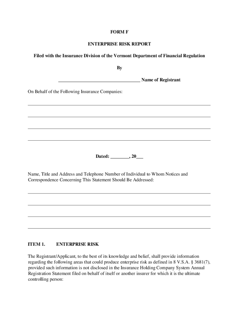 FORM F ENTERPRISE RISK REPORT Filed with the Insurance Division of the Vermont Department of Financial Regulation By Name of Registrant On Behalf of the Following Insurance Companies: Dated:, 20 Names,