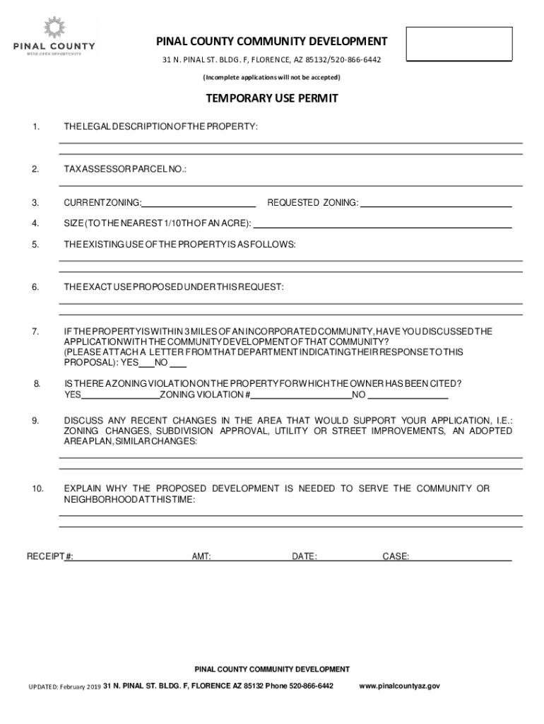 PINAL COUNTY COMMUNITY DEVELOPMENT 31 N. FINAL ST. BLDG. F, FLORENCE, AZ 85132/5208666442 (Incomplete applications will not be accepted)TEMPORARY USE PERMIT 1.THE LEGAL DESCRIPTION OF THE PROPERTY:2.TAX