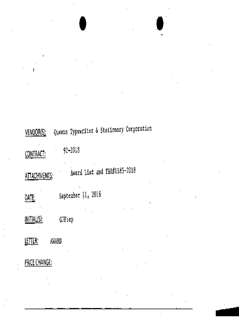 VENDOR(S):Queens Typewriter & Stationary CorporationCONTRACT:922018ATTACHMENTS:Award List and TAR#ll852018DATE:September ll, 2018INITIALS):GDF: letter:AWARDPRICE CHANGE:Page 1 of 1Elaine Peterson