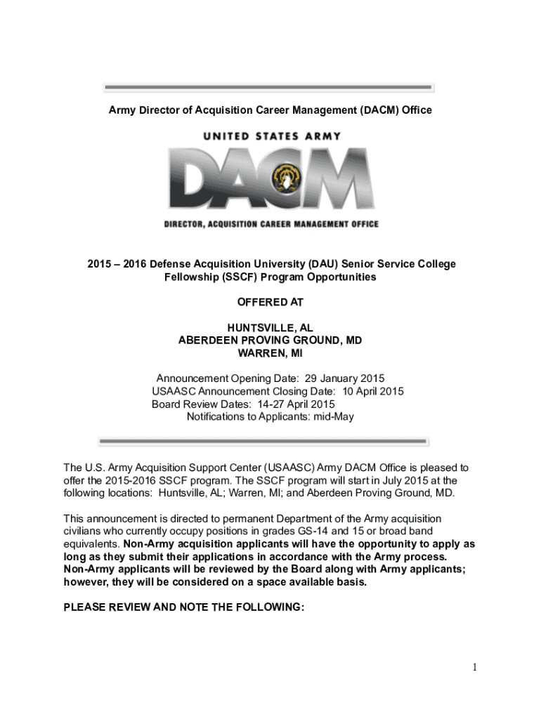 Army Director of Acquisition Career Management (DAM) Office! 2015 2016 Defense Acquisition University (DAU) Senior Service College Fellowship (SNCF) Program Opportunities OFFERED AT HUNTSVILLE, AL