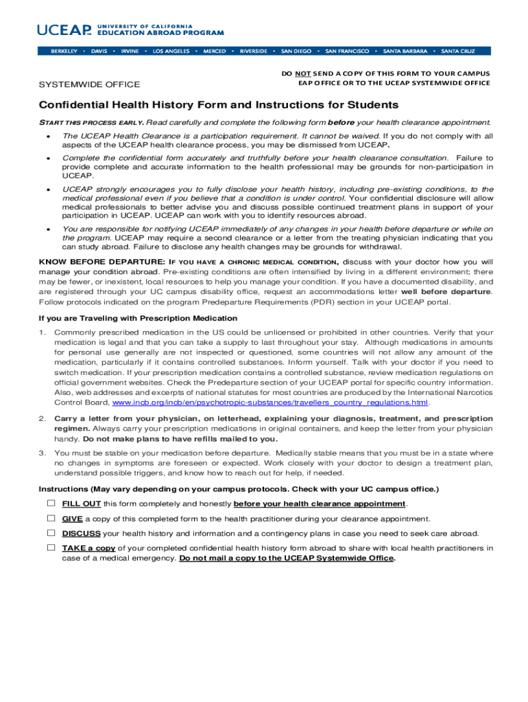 SYSTEMIZE OFFICE DO NOT SEND A COPY OF THIS FORM TO YOUR CAMPUS EAP OFFICE OR TO THE UC EAP SYSTEMIZE OFFICEConfidential Health History Form and Instructions for Students START THIS PROCESS EARLY.