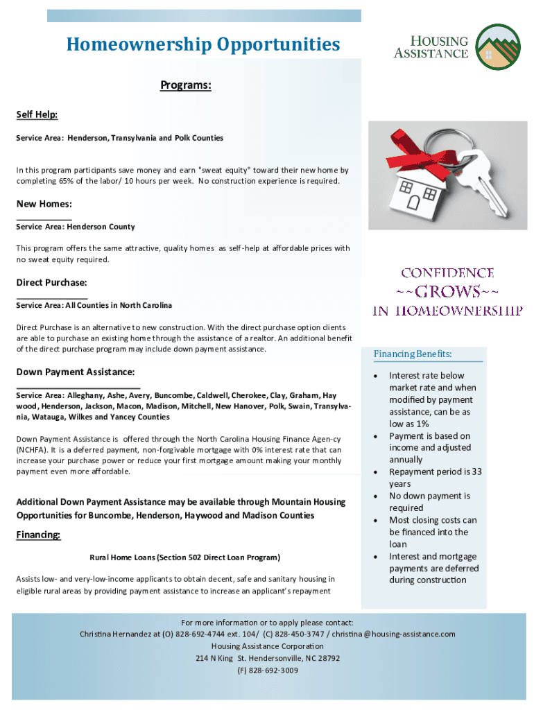 Homeownership Opportunities Programs: Self Help: Service Area: Henderson, Transylvania and Polk Counties In this program participants save money and earn “sweat equity toward their new home by completing