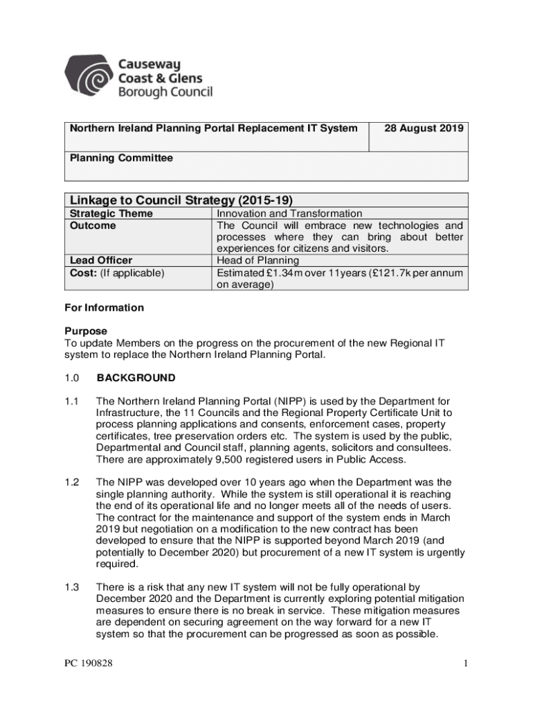 Northern Ireland Planning Portal Replacement IT System28 August 2019Planning CommitteeLinkage to Council Strategy (201519) Strategic Theme OutcomeLead Officer Cost: (If applicable)Innovation and Transformation