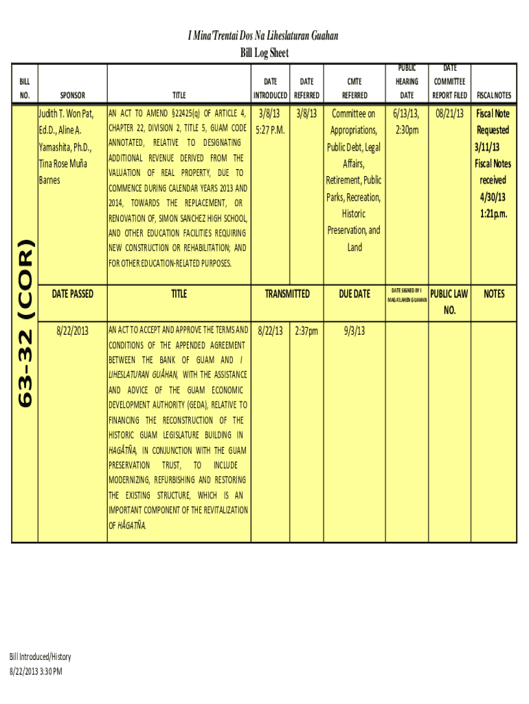 Get the free I Mina'Trentai Dos Na Liheslaturan Guahan Bill Log Sheet