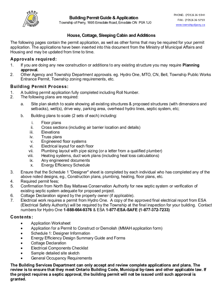 Building Permit Guide & Application Township of Perry, 1695 Ems dale Road, Ems dale ON P0A 1J0PHONE: (705)6365941 FAX: (705)6365759www.townshipofperry.carouse, Cottage, Sleeping Cabin and Additions