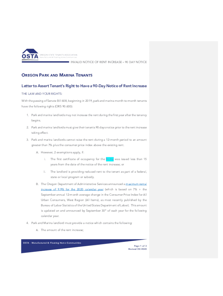 INVALID NOTICE OF RENT INCREASE 90 DAY NOTICEOREGON PARK AND MARINA TENANTS Letter to Assert Tenants Right to Have a 90Day Notice of Rent Increase THE LAW AND YOUR RIGHTS: With the passing of Senate