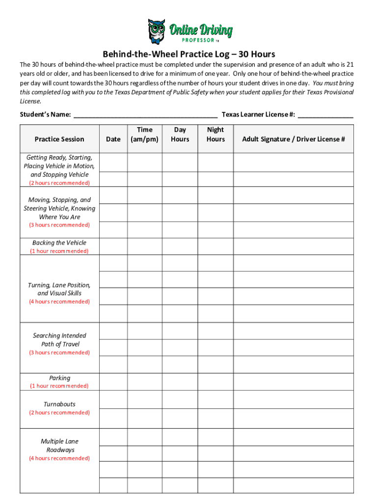 BehindtheWheel Practice Log 30 Hours The 30 hours of behindthewheel practice must be completed under the supervision and presence of an adult who is 21 years old or older, and has been licensed to