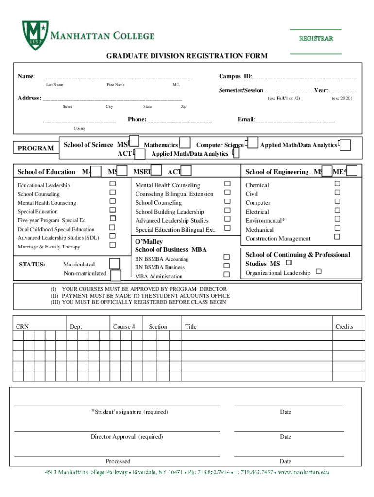 REGISTRARGRADUATE DIVISION REGISTRATION FORM Name: Last NameFirst NameCampus ID: M.I. Semester/Session Year: Address: StreetCityState (ex: Fall/1 or /2)(ex: 2020)iPhone: Email: CountyPROGRAM :School