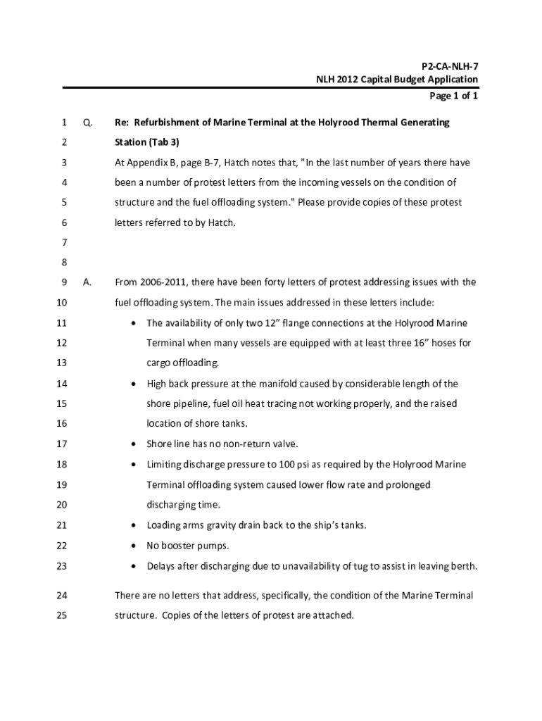 P2CANLH7 NLH2012CapitalBudgetApplication Page1of1 1Q. Re:RefurbishmentofMarineTerminalattheHolyroodThermalGenerating2Station(Tab3)3AtAppendixB,pageB7,Hatchnotesthat, “Inthelastnumberofyearstherehave4beenanumberofprotestlettersfromtheincomingvesselsontheconditionof5structureandthefueloffloadingsystem.