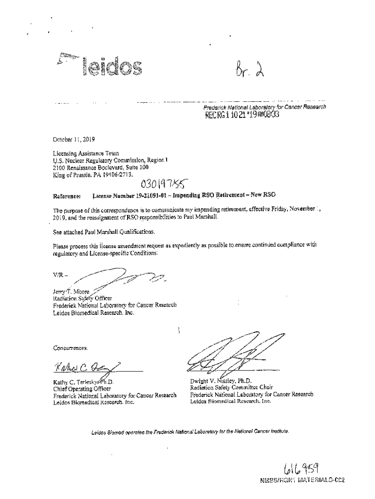 Frederick National Laboratory for Cancer ResearchRECRGi 1021 19AM08G3 7October 11, 2019 Licensing Assistance Team. S. Nuclear Regulatory Commission, Region I 2100 Renaissance Boulevard, Suite 100