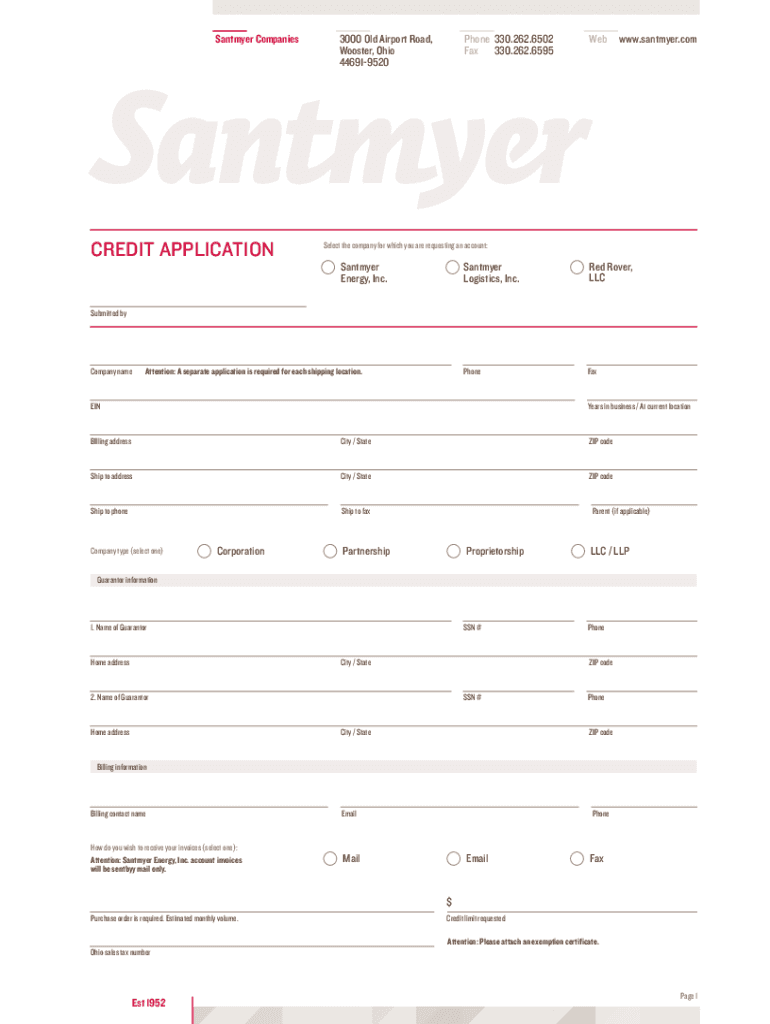 Sawyer CompaniesCREDIT APPLICATION3000 Old Airport Road, Wooster, Ohio 446919520Phone330.262.6502 Fax330.262.6595Webwww. Sawyer.collect the company for which you are requesting an account:Sawyer Energy,
