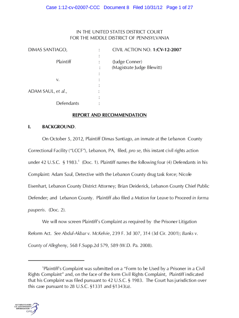 Case 1:12cv02007CCC Document 8 Filed 10/31/12-Page 1 of 27IN THE UNITED STATES DISTRICT COURT FOR THE MIDDLE DISTRICT OF PENNSYLVANIA DUMAS SANTIAGO, Plaintiff. ADAM SAUL, et al., Defendants: : :