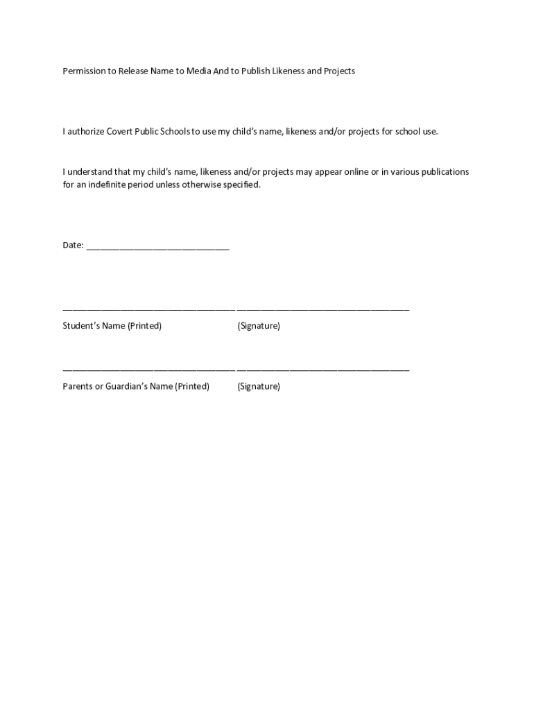Permission to Release Name to Media And to Publish Likeness and Projects authorize Covert Public Schools to use my children name, likeness and/or projects for school use. I understand that my children