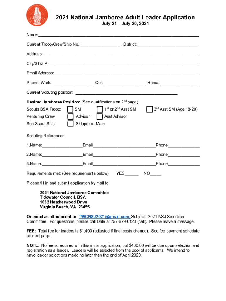 2021 National Jamboree Adult Leader Application July 21 July 30, 2021, Name: Current Troop/Crew/Ship No.: District: Address: City/ST/ZIP: Email Address: Phone: Work: Cell: Home: Current Scouting position: