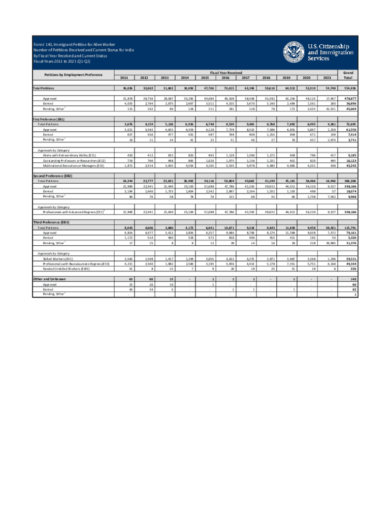 Form I140, Immigrant Petition for Alien Worker Number of Petitions Received and Current Status for India By Fiscal Year Received and Current Status Fiscal Years 2011 to 2021 (Q1Q2) Petitions by Employment