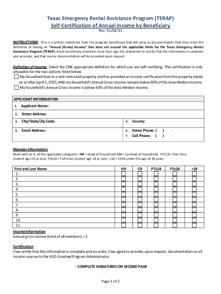Texas Emergency Rental Assistance Program (TRAP) Recertification of Annual Income by Beneficiary Rev. 01/06/21 INSTRUCTIONS: This is a written statement from the program beneficiary that will serve
