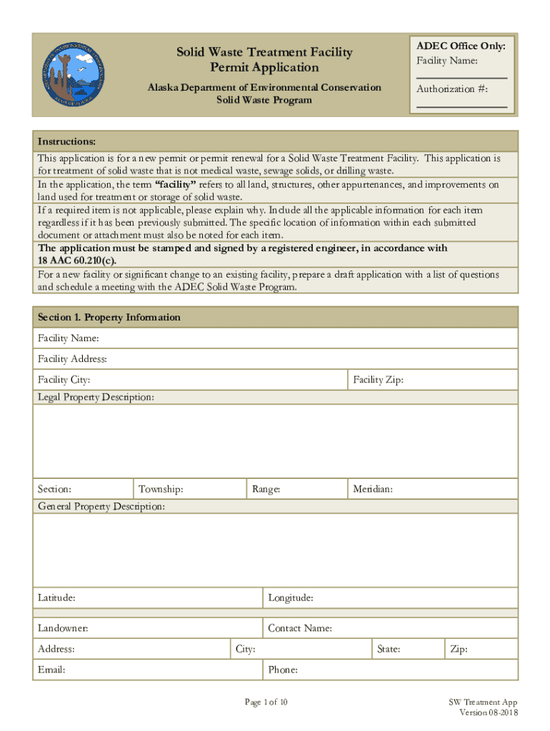 ADC Office Only: Facility Name:Solid Waste Treatment Facility Permit Application Alaska Department of Environmental Conservation Solid Waste ProgramAuthorization #:Instructions: This application is