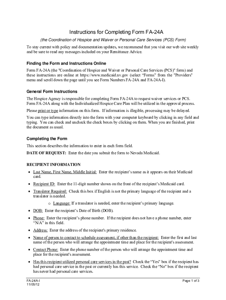 Instructions for Completing Form FA24A (the Coordination of Hospice and Waiver or Personal Care Services (PCS) Form) To stay current with policy and documentation updates, we recommend that you visit