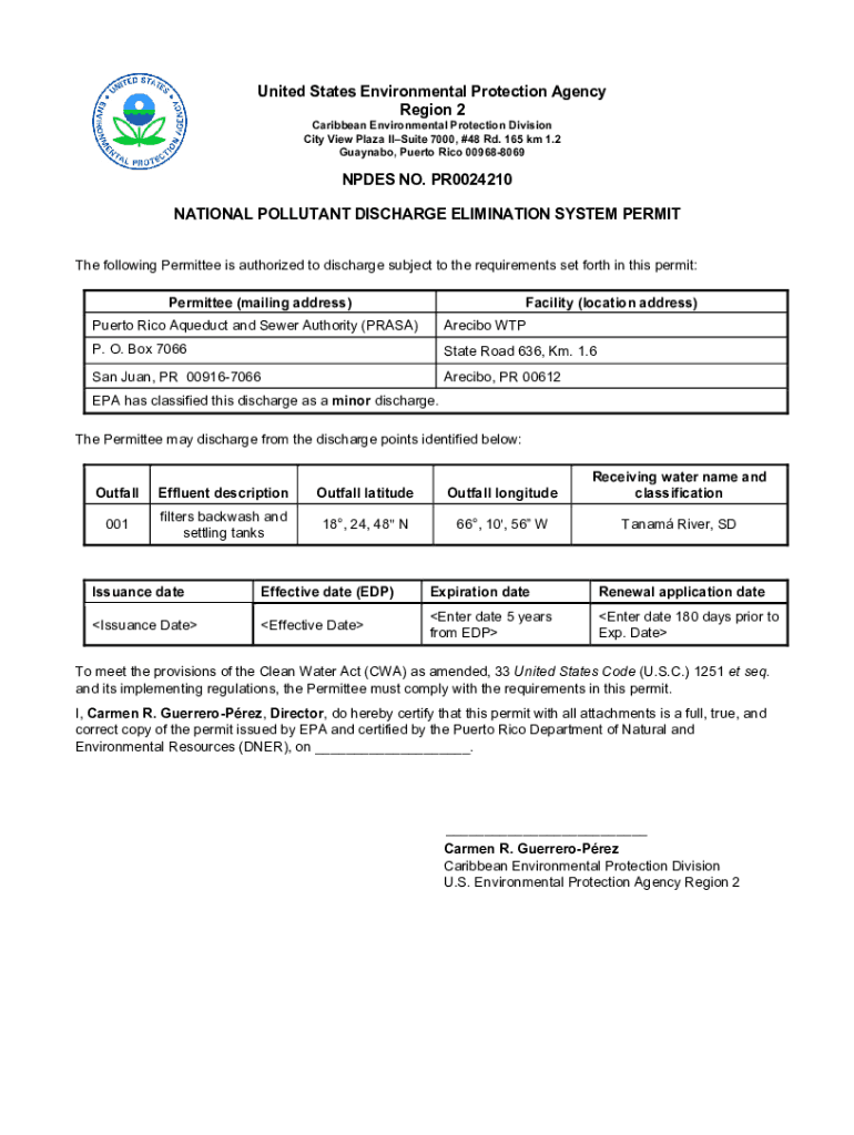 United States Environmental Protection Agency Region 2 Caribbean Environmental Protection Division City View Plaza Suite 7000, #48 Rd. 165 km 1.2 Guaynabo, Puerto Rico 009688069NPDES NO. PR0024210