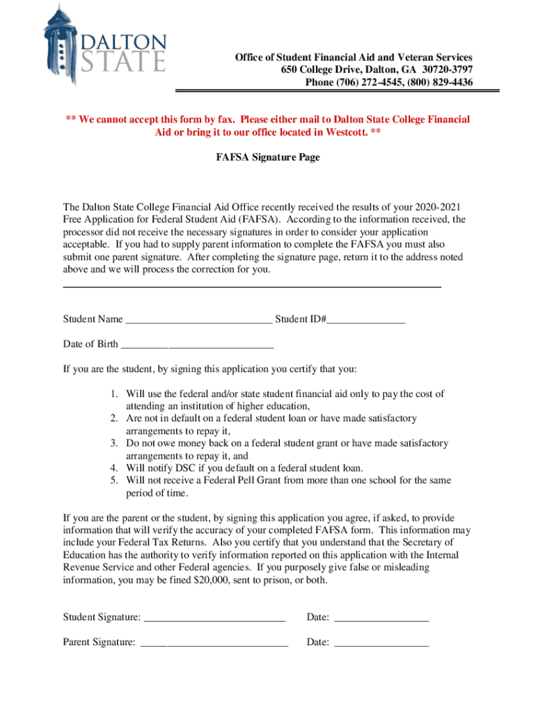 Office of Student Financial Aid and Veteran Services 650 College Drive, Dalton, GA 307203797 Phone (706) 2724545, (800) 8294436** We cannot accept this form by fax. Please either mail to Dalton State
