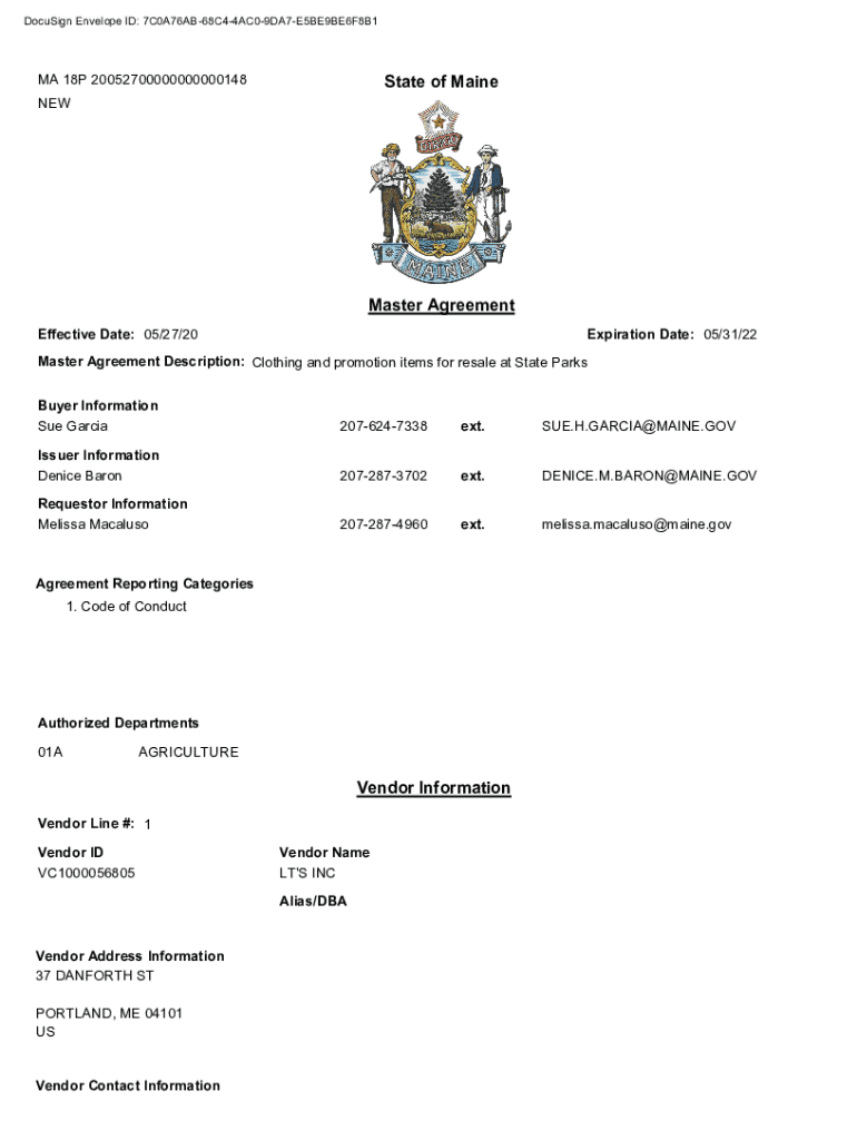 DocuSign Envelope ID: 7C0A76AB68C44AC09DA7E5BE9BE6F8B1MA 18P 20052700000000000148State of MaineNEWMaster Agreement Effective Date: 05/27/20Expiration Date: 05/31/22Master Agreement Description: Clothing
