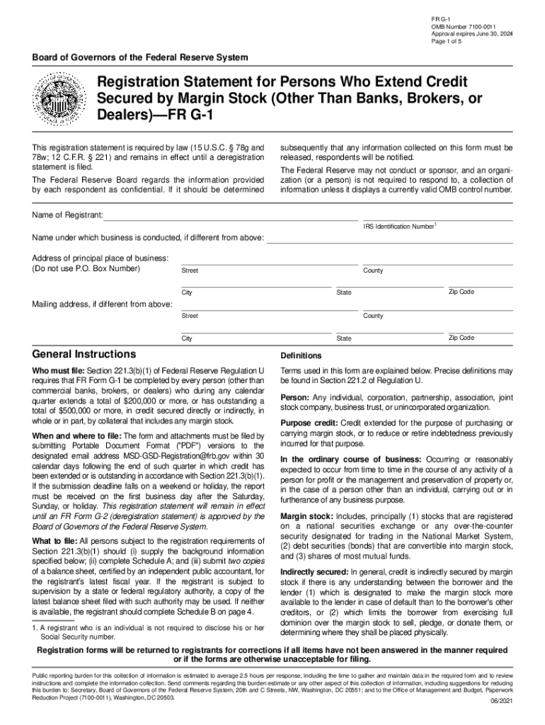 FR G1 OMB Number 71000011 Approval expires June 30, 2024 Page 1 of 5Board of Governors of the Federal Reserve SystemRegistration Statement for Persons Who Extend Credit Secured by Margin Stock (Other