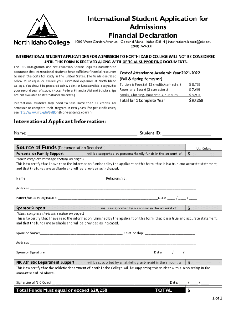 International Student Application for Admissions Financial Declaration1000 West Garden Avenue Four Darlene, Idaho 83814 international admit NIC.edu (208) 7693311INTERNATIONAL STUDENT APPLICATIONS