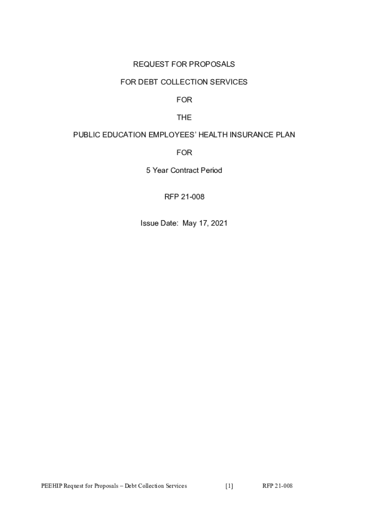 REQUEST FOR PROPOSALS FOR DEBT COLLECTION SERVICES FOR THE PUBLIC EDUCATION EMPLOYEES HEALTH INSURANCE PLAN FOR 5 Year Contract Period RFP 21008 Issue Date: May 17, 2021PEEHIP Request for Proposals