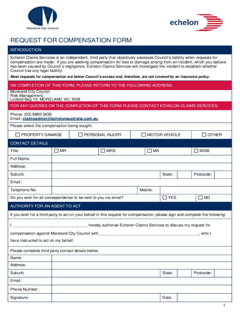 REQUEST FOR COMPENSATION FORM INTRODUCTION Echelon Claims Services is an independent, third party that objectively assesses Councils liability when requests for compensation are made. If you are seeking