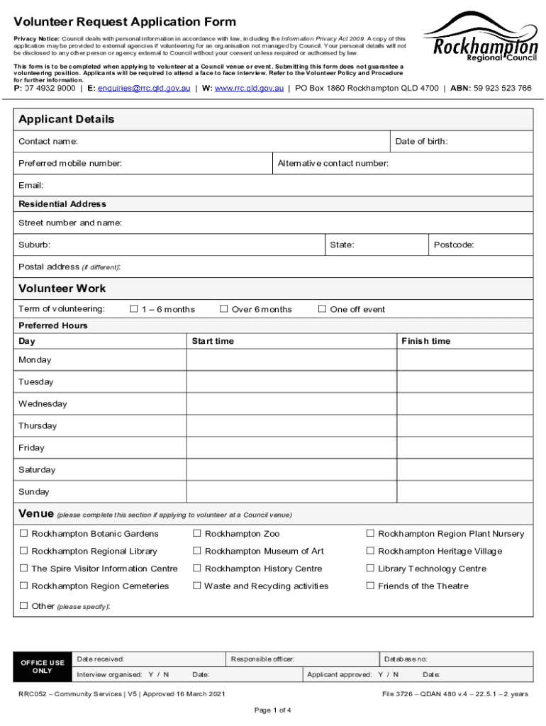 Volunteer Request Application Form Privacy Notice: Council deals with personal information in accordance with law, including the Information Privacy Act 2009. A copy of this application may be provided