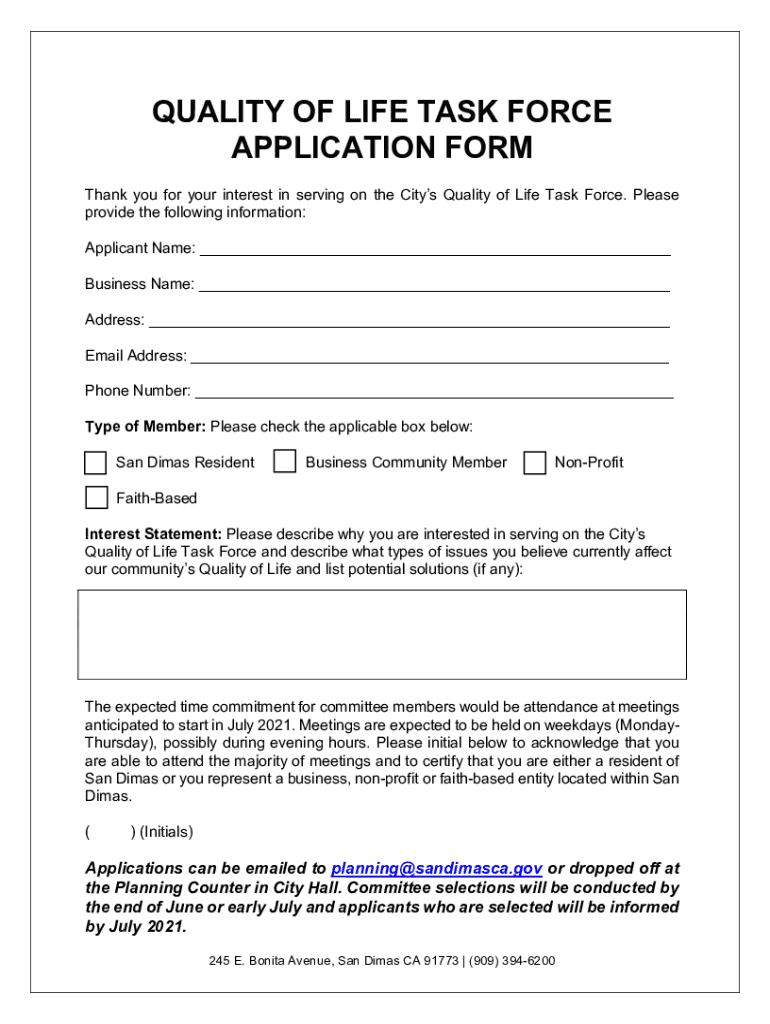 Quality of Life Task Force The City of San Dimas is currently accepting applications for the newly formed Quality of Life Task Force. The City of San Dimas is embarking on a path to preserve and improve