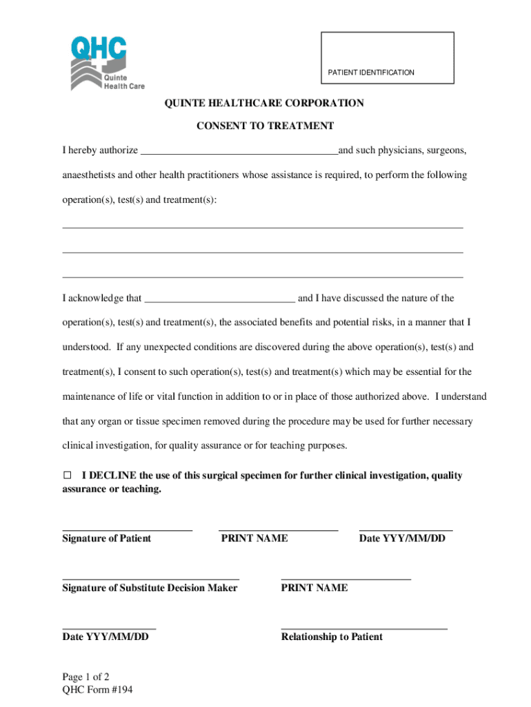 PATIENT IDENTIFICATIONQUINTE HEALTHCARE CORPORATION CONSENT TO TREATMENT I hereby authorize and such physicians, surgeons, anesthetists and other health practitioners whose assistance is required,
