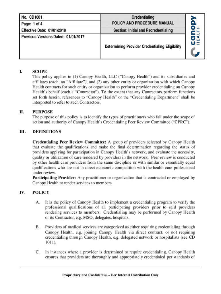 No. CD1001 Page: 1 of 4 Effective Date: 01/01/2018 Previous Versions Dated: 01/01/2017Credentialing POLICY AND PROCEDURE MANUAL Section: Initial and Re credentialing Determining Provider Credentialing