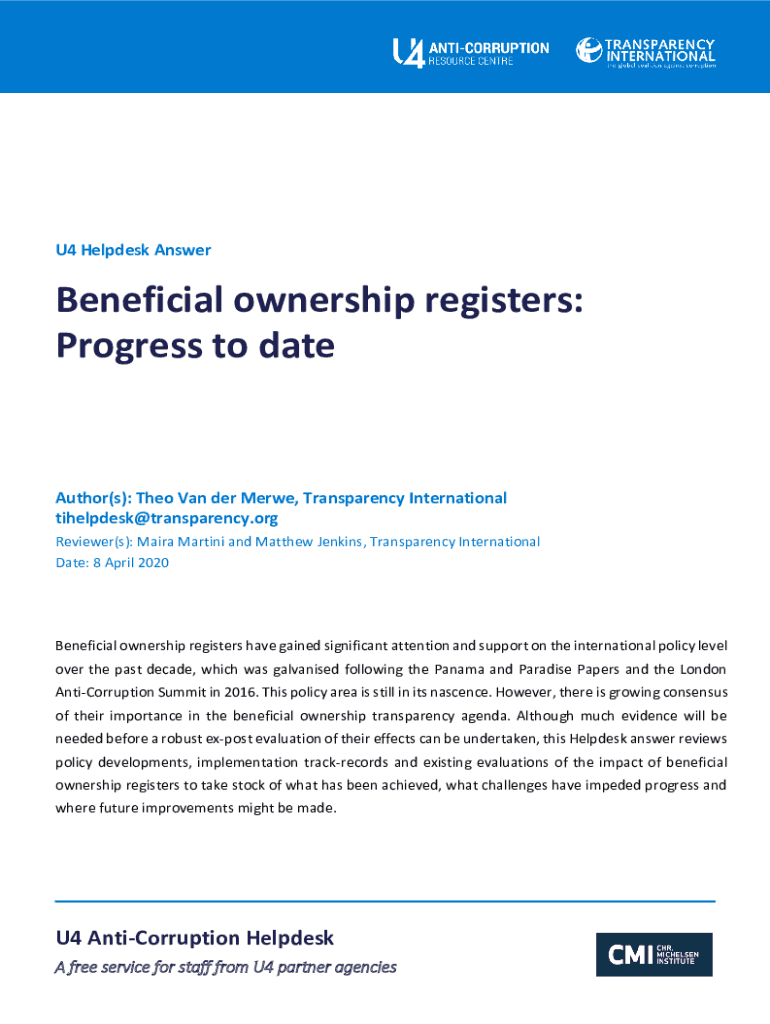 U4 Help desk AnswerBeneficial ownership registers: Progress to dateAuthor(s): Theo Van her Mere, Transparency International tihelpdesk@transparency.org Reviewer(s): Area Martini and Matthew Jenkins,