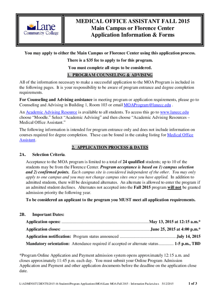 MEDICAL OFFICE ASSISTANT FALL 2015 Main Campus or Florence Center Application Information & Forms You may apply to either the Main Campus or Florence Center using this application process. There is