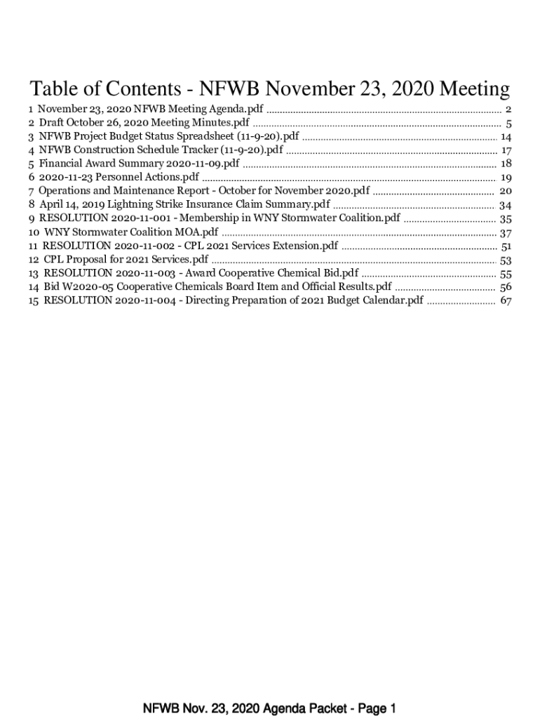 Table of Contents CFWB November 23, 2020, Meeting 1 November 23, 2020, CFWB Meeting Agenda.pdf 2 Draft October 26, 2020, Meeting Minutes.pdf 3 CFWB Project Budget Status Spreadsheet (11920).pdf 4
