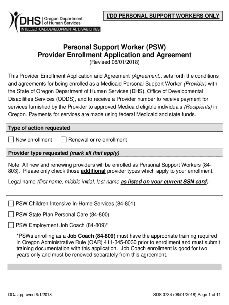I/DD PERSONAL SUPPORT WORKERS ONLYPersonal Support Worker (NSW) Provider Enrollment Application and Agreement (Revised 08/01/2018) This Provider Enrollment Application and Agreement (Agreement), sets