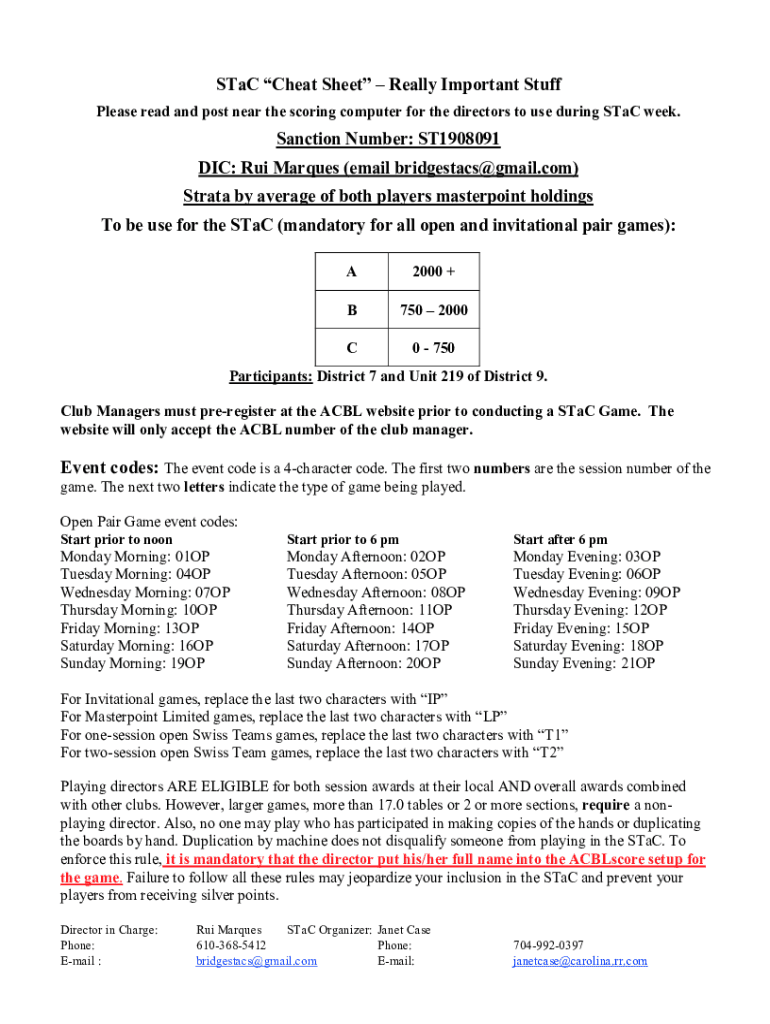 Get the free STaC Cheat SheetReally Important Stuff Sanction ... - ACBL - web2 acbl