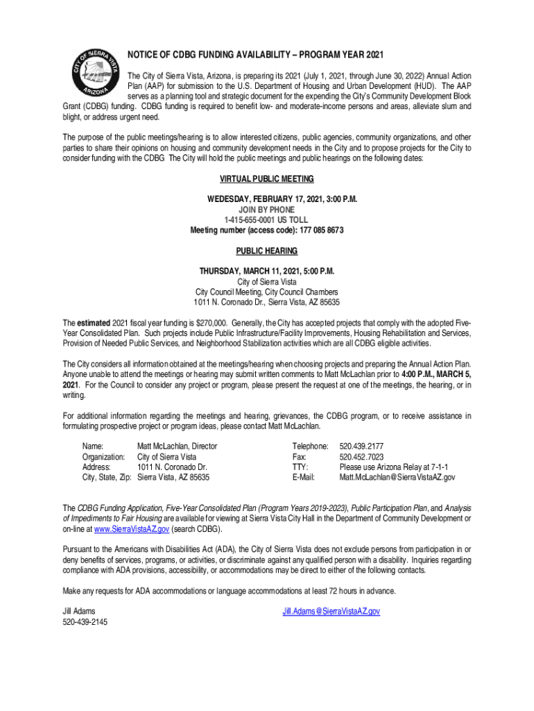 NOTICE OF CBG FUNDING AVAILABILITY PROGRAM YEAR 2021 The City of Sierra Vista, Arizona, is preparing its 2021 (July 1, 2021, through June 30, 2022) Annual Action Plan (AAP) for submission to the U.S.
