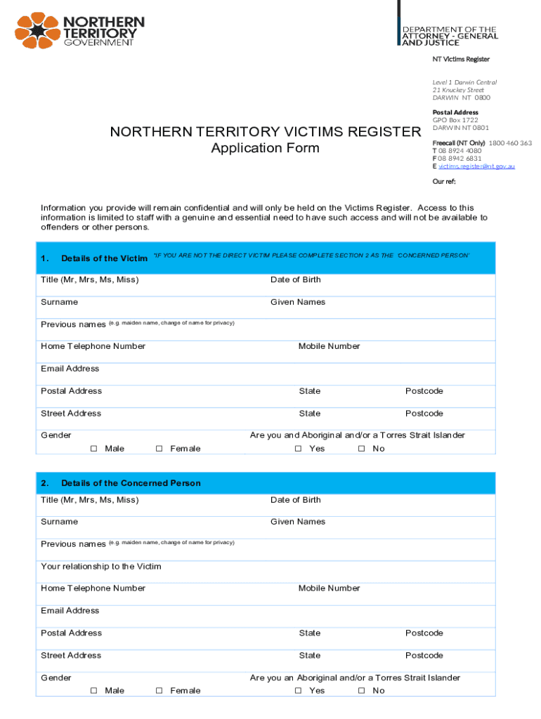 NT Victims Register Level 1 Darwin Central 21 Knocked Street DARWIN NT 0800NORTHERN TERRITORY VICTIMS REGISTER Application Formosa Address GPO Box 1722 DARWIN NT 0801 Free call (NT Only) 1800 460