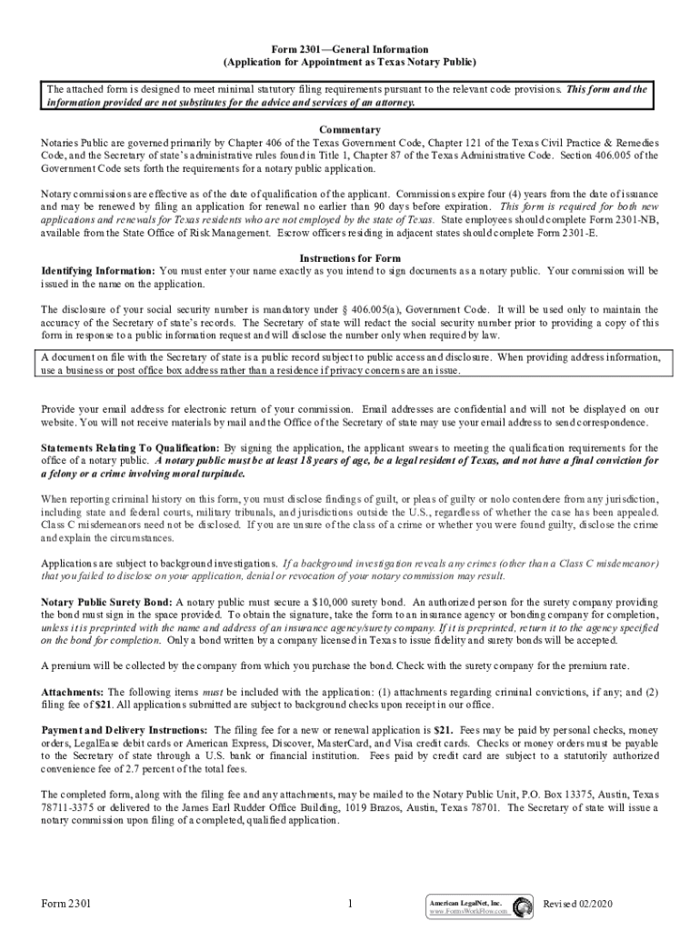 Form 2301General Information (Application for Appointment as Texas Notary Public) The attached form is designed to meet minimal statutory filing requirements pursuant to the relevant code provisions.