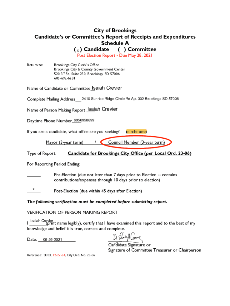City of Brookings Candida e s or Commit EE s Report of Recap s and E Wendi res Schedule A () Candidate () Committee Post Election Report Due May 28, 2021, Return to:Brookings City Clerks Office Brookings