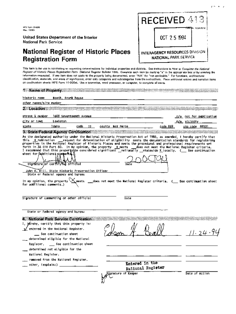 RECEIVED NPS Form 10900 (Rev. 10/90)to. / 0240018OCT 2 5 B94United States Department of the Interior National Park ServiceNational Register of Historic Places Registration FormINTERAGENCY RESOURCES