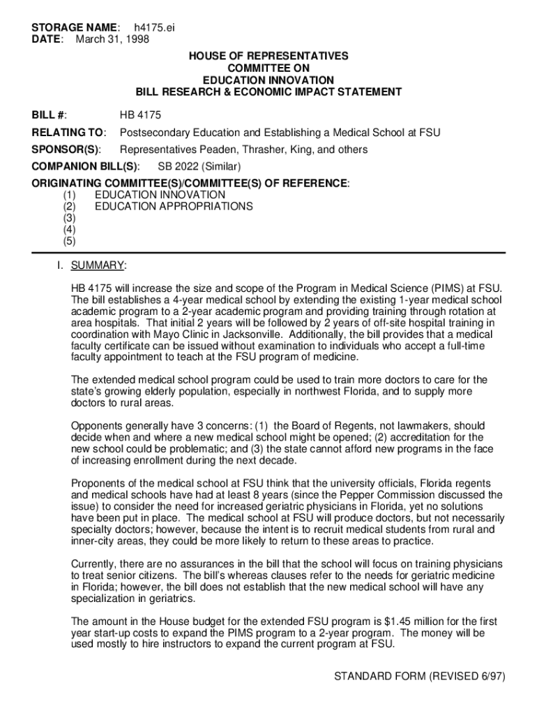 STORAGE NAME: h4175.a DATE: March 31, 1998, HOUSE OF REPRESENTATIVES COMMITTEE ON EDUCATION INNOVATION BILL RESEARCH & ECONOMIC IMPACT STATEMENT BILL #:HE 4175RELATING TO:Postsecondary Education and
