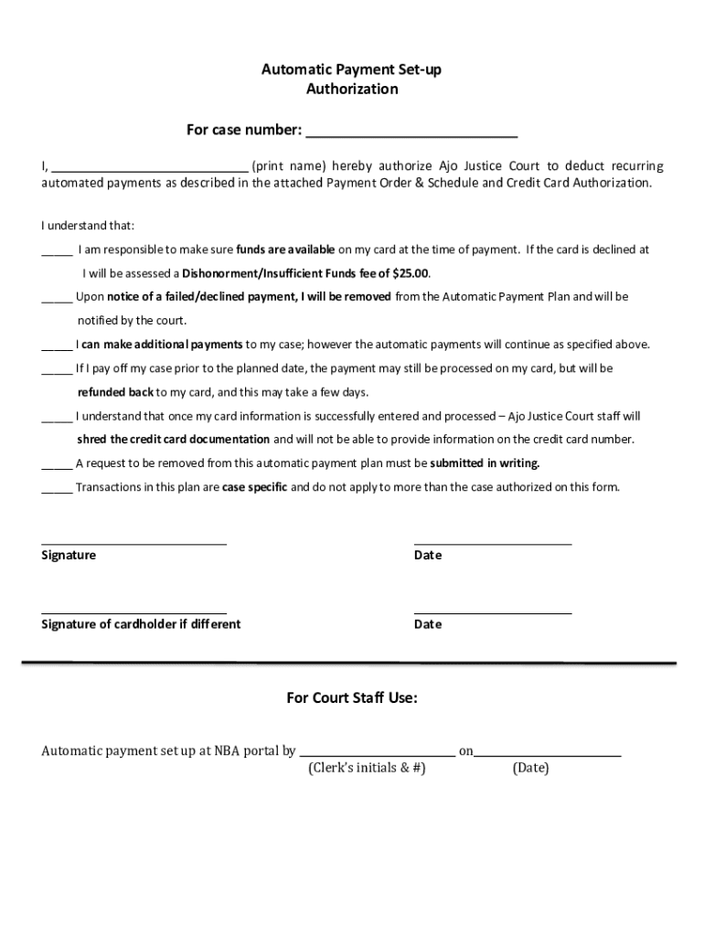 Automatic Payment Setup Authorization For case number: I, (print name) hereby authorize AJO Justice Court to deduct recurring automated payments as described in the attached Payment Order & Schedule