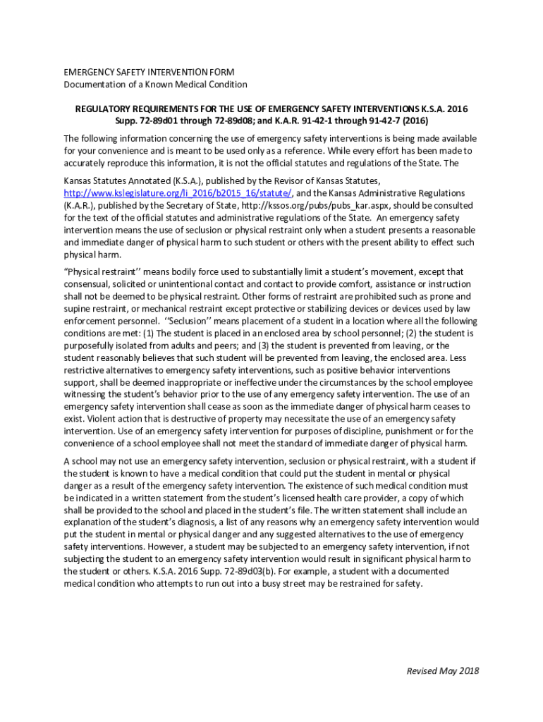 EMERGENCY SAFETY INTERVENTION FORM Documentation of a Known Medical Condition REGULATORY REQUIREMENTS FOR THE USE OF EMERGENCY SAFETY INTERVENTIONS K.S.A. 2016 Supp. 7289d01 through 7289d08; and K.A.R.
