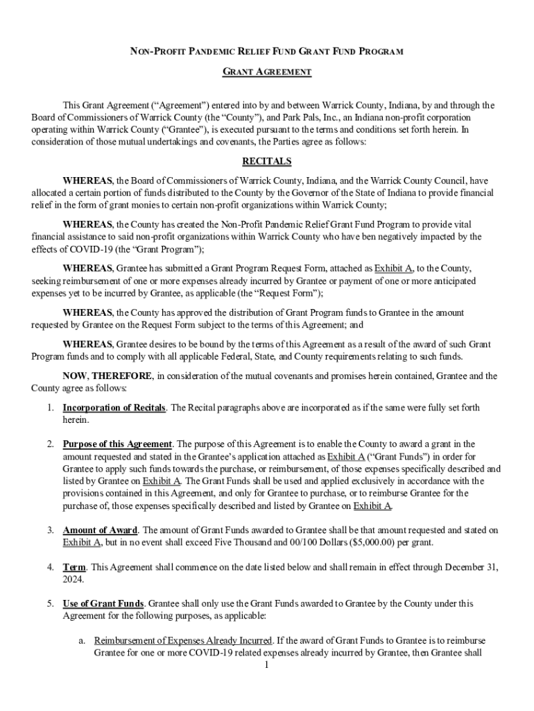NONPROFIT PANDEMIC RELIEF FUND GRANT FUND PROGRAM GRANT AGREEMENT This Grant Agreement (Agreement) entered into by and between Warrick County, Indiana, by and through the Board of Commissioners of