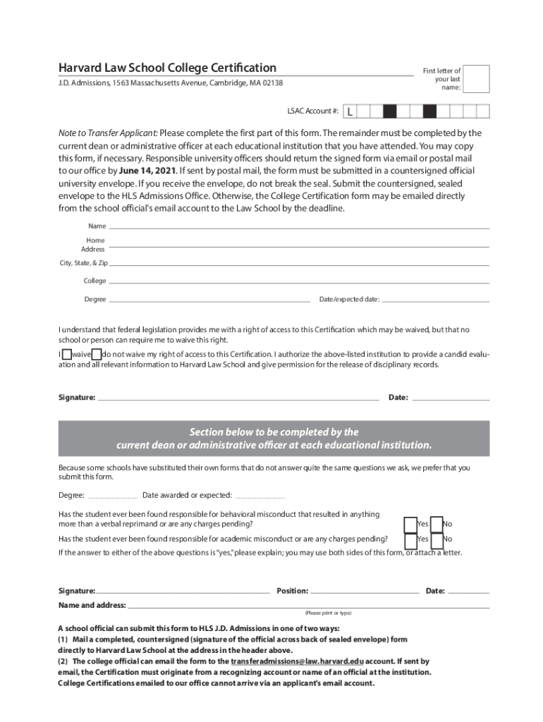 Harvard Law School College CertificationFirst letter of your last name:J.D. Admissions, 1563 Massachusetts Avenue, Cambridge, MA 02138 SAC Account #:Note to Transfer Applicant: Please complete the